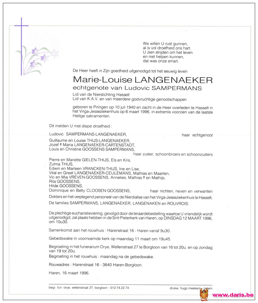 Langenaeker, Marie‑Louise, geboren op 10-07-1940 te Piringen, overleden op 06-03-1996 te Hasselt op 55-jarige leeftijd.