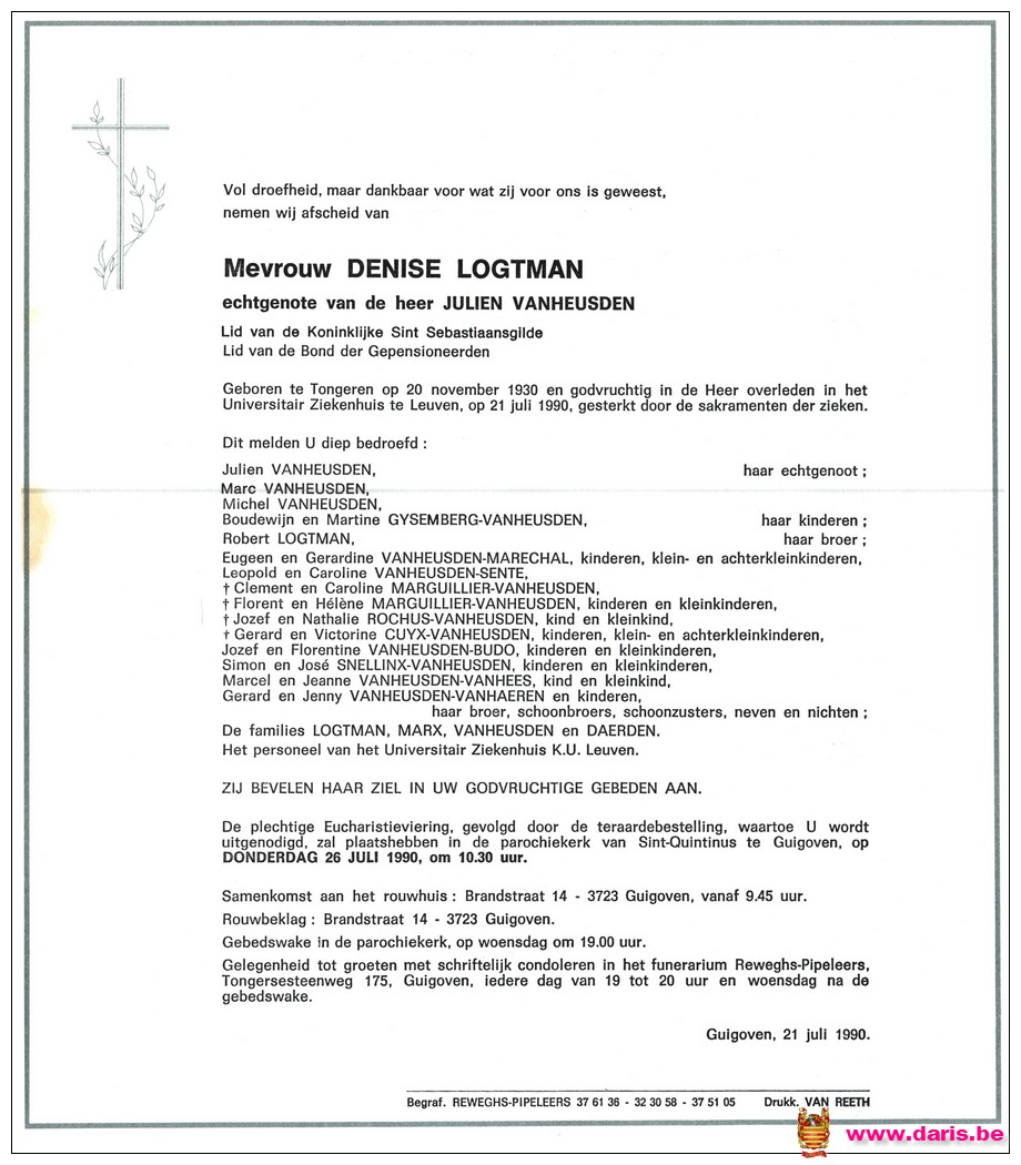 Logtman, Denise, geboren op 20-11-1930 te Tongeren, overleden op 21-07-1990 te Leuven op 59-jarige leeftijd.