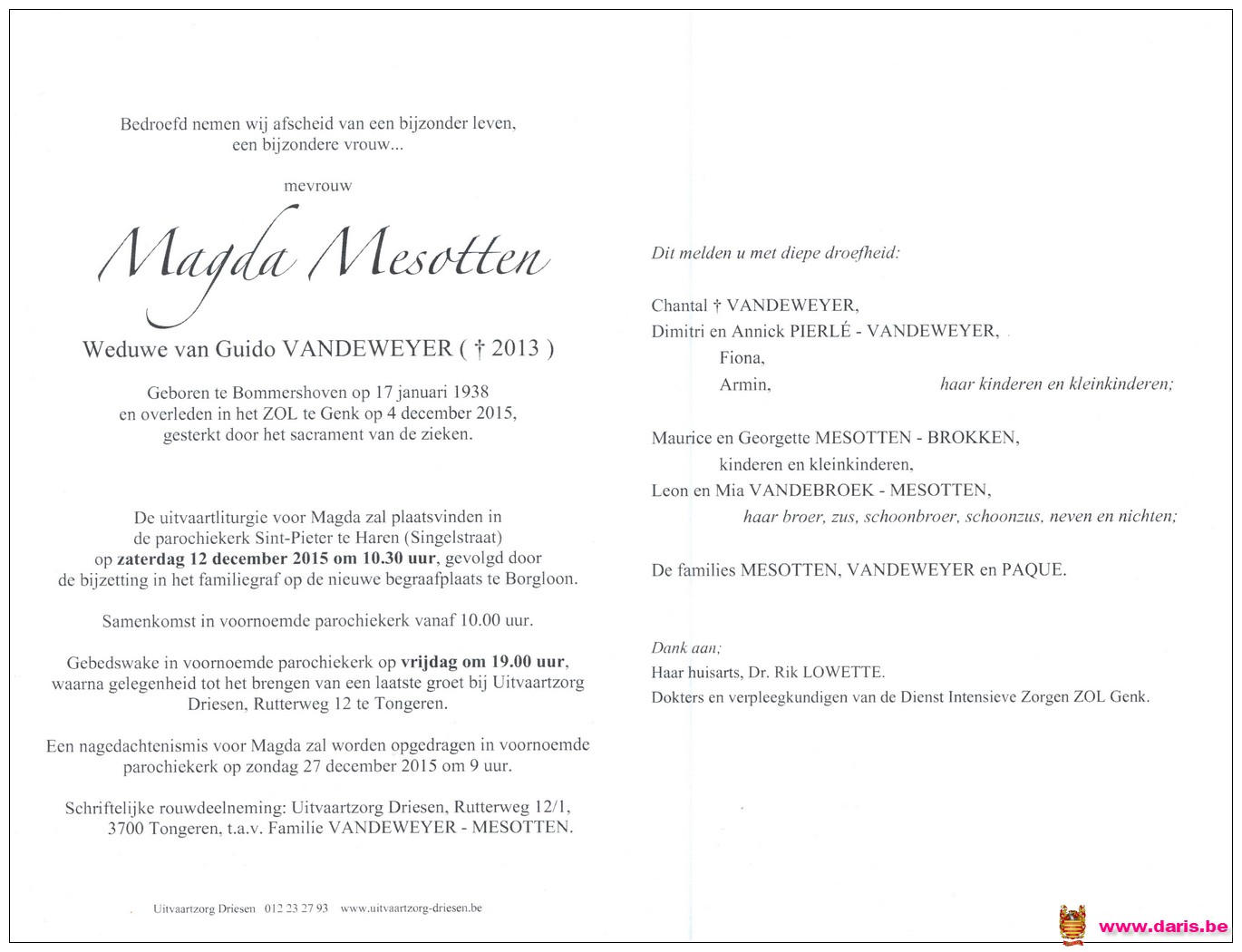 Mesotten, Magda, geboren op 17-01-1938 te Bommershoven, overleden op 04-12-2015 te Genk op 77-jarige leeftijd.