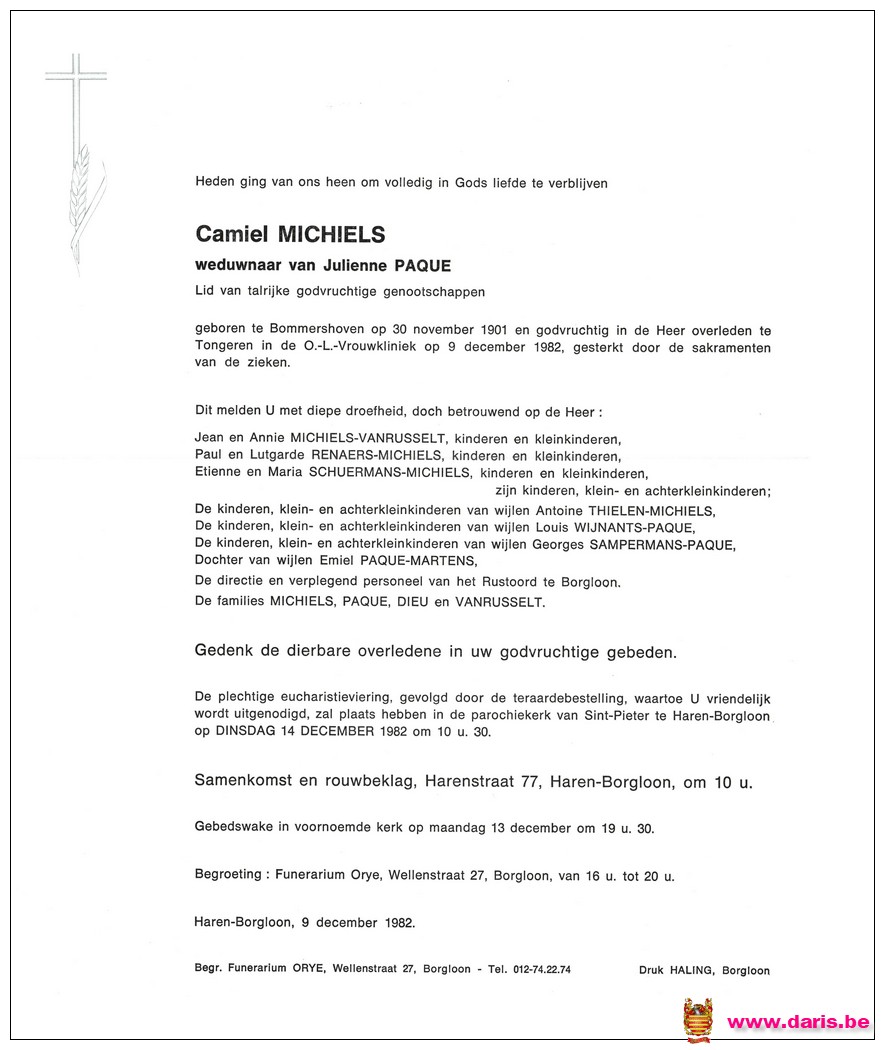 Michiels, Camile, geboren op 30-11-1901 te Bommershoven, overleden op 09-12-1982 te Tongeren op 81-jarige leeftijd.
