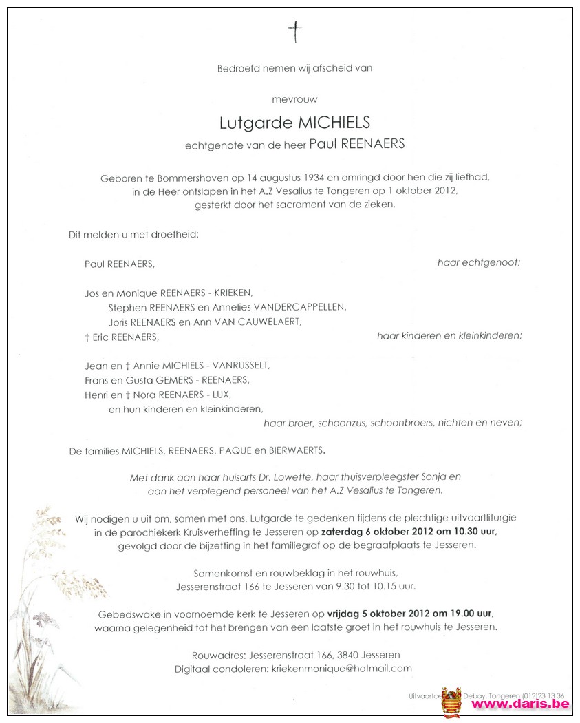 Michiels, Lutgarde, geboren op 14-08-1934 te Bommershoven, overleden op 01-10-2012 te Jesseren op 78-jarige leeftijd.