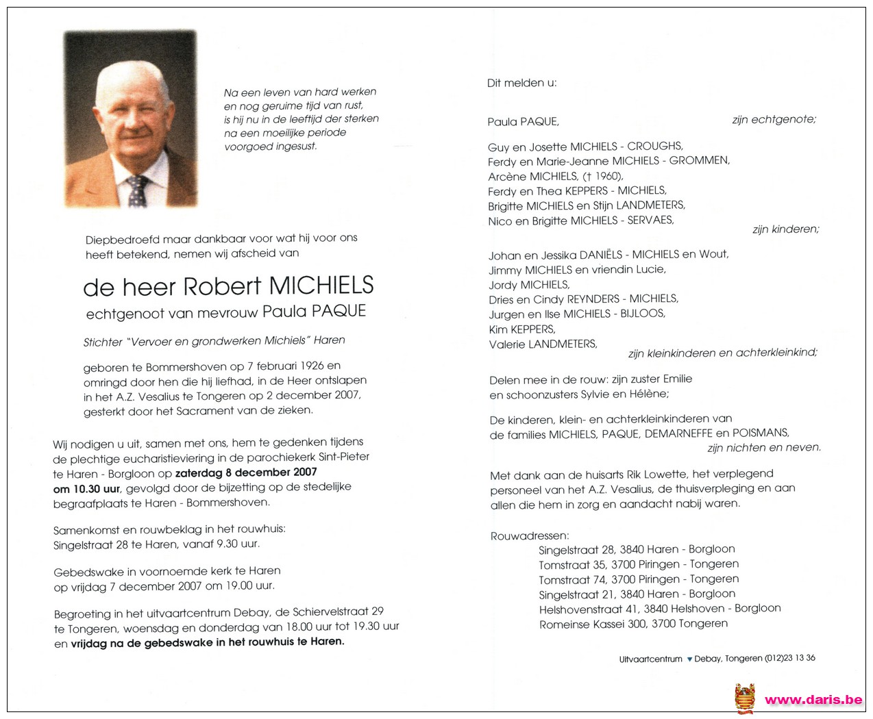 Michiels, Robert, geboren op 07-02-1926 te Bommershoven, overleden op 02-12-2007 te Tongeren op 81-jarige leeftijd.