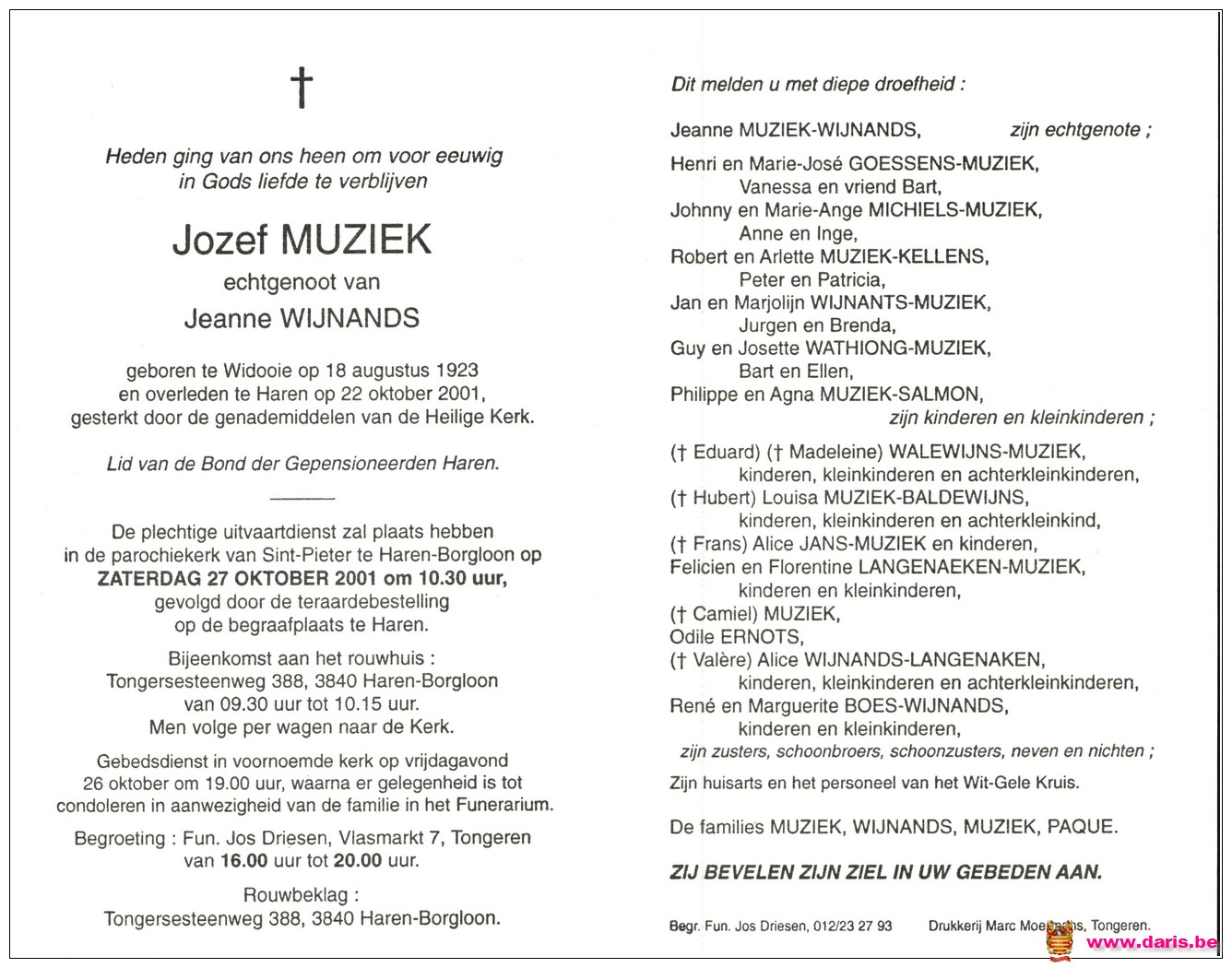 Muziek, Jozef, geboren op 18-08-1923 te Widooie, overleden op 22-10-2001 te Haren op 78-jarige leeftijd.