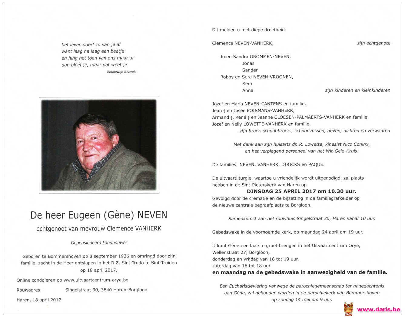 Neven, Eugene, geboren op 08-09-1936 te Bommershoven, overleden op 18-04-2017 te Sint-Truiden op 80-jarige leeftijd.