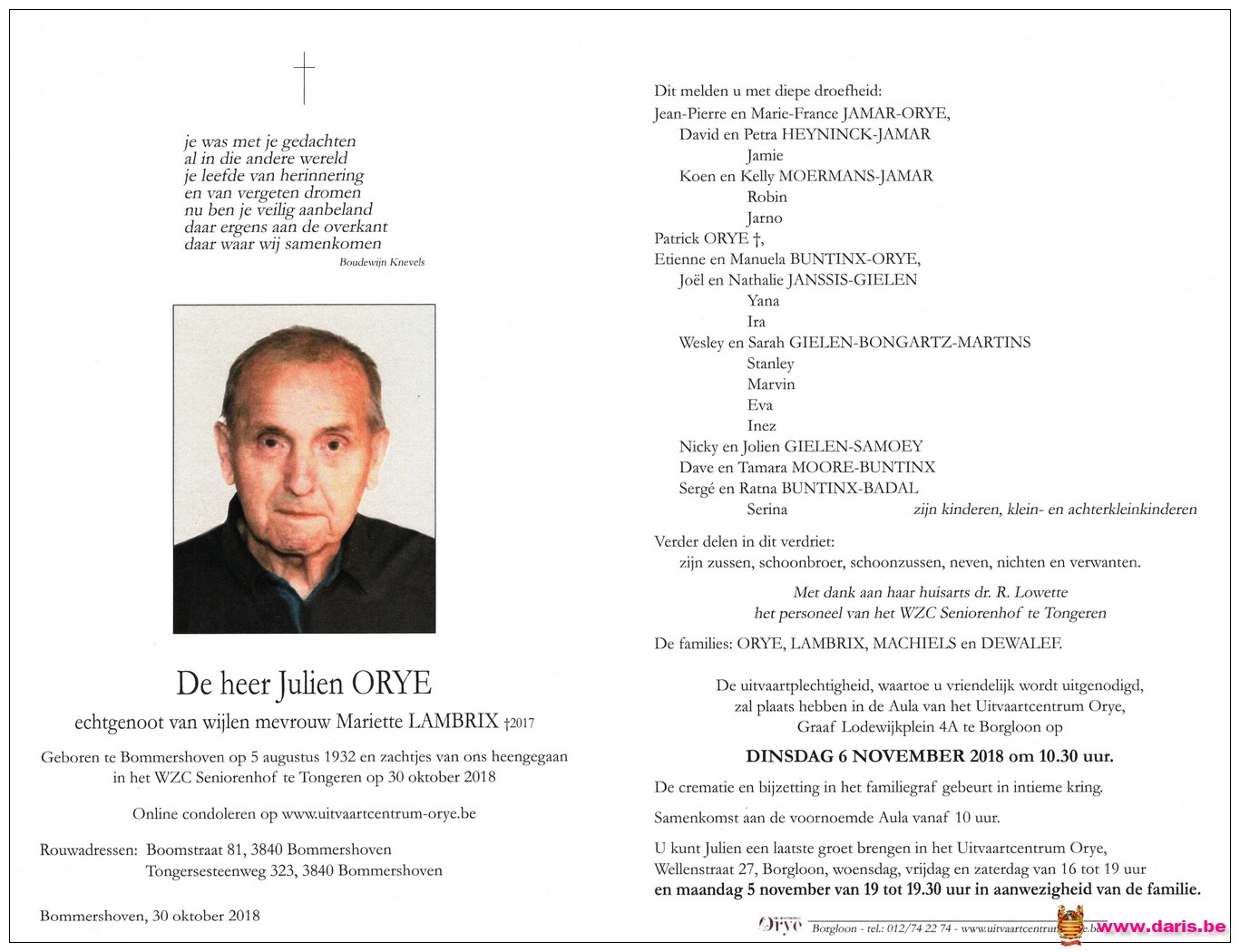 Orye, Julien, geboren op 05-08-1932 te Bommershoven, overleden op 30-10-2018 te Borgloon op 86-jarige leeftijd.