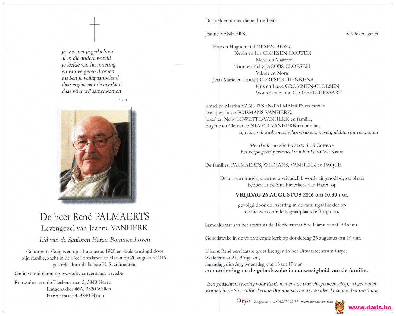 Palmaerts, René, geboren op 11-08-1929 te Guigoven, overleden op 20-08-2016 te Haren op 87-jarige leeftijd.