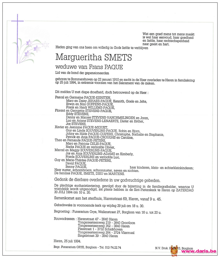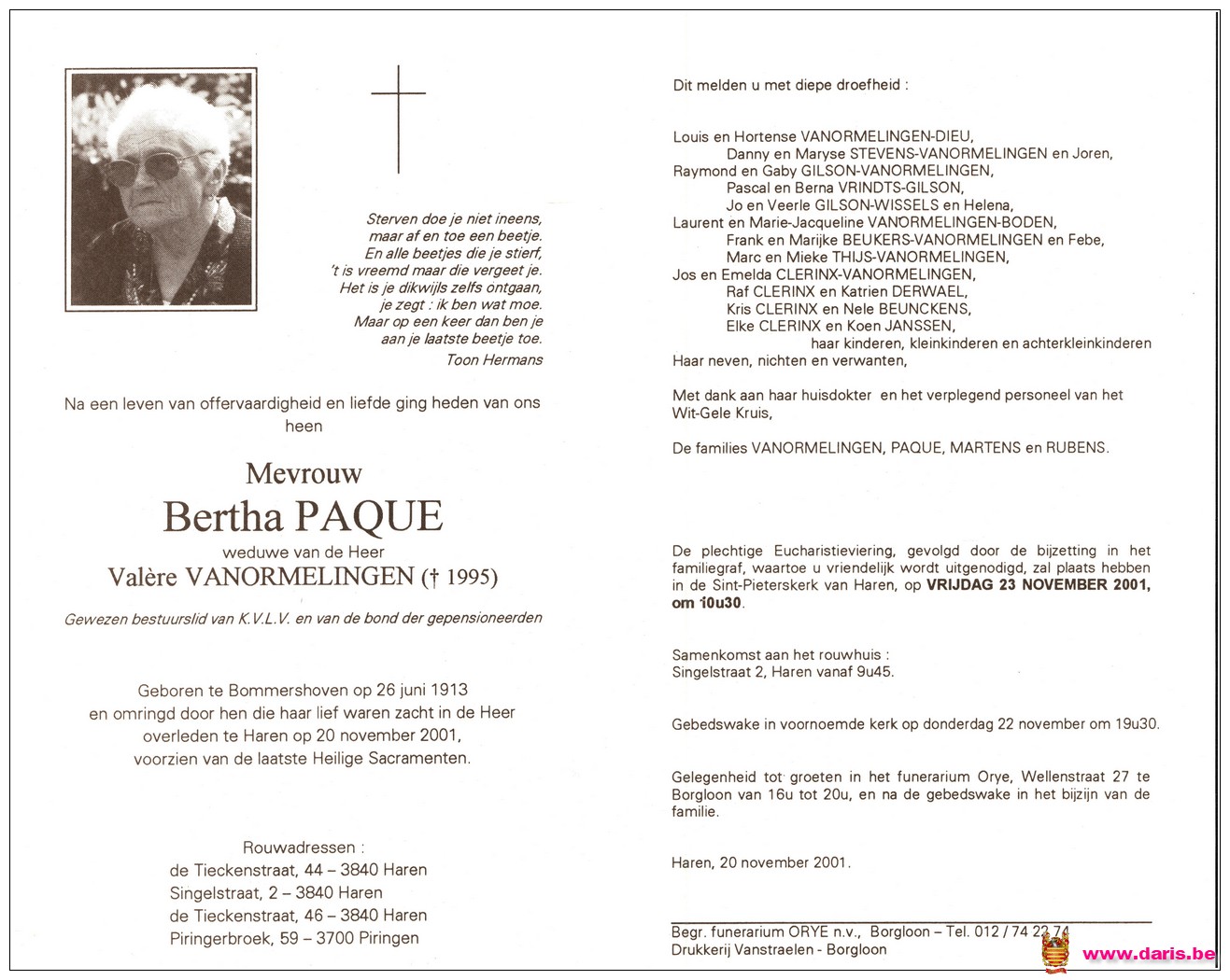 Paque, Bertha, geboren op 26-06-1913 te Bommershoven, overleden op 20-11-2001 te Haren op 88-jarige leeftijd.