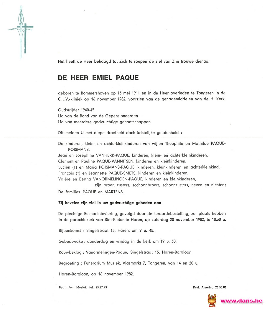 Paque, Emile, geboren op 13-05-1911 te Bommershoven, overleden op 16-11-1982 te Tongeren op 71-jarige leeftijd.