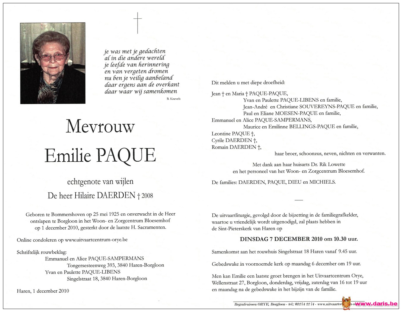Paque, Emilie, geboren op 25-05-1925 te Bommershoven, overleden op 01-12-2010 te Borgloon op 85-jarige leeftijd.