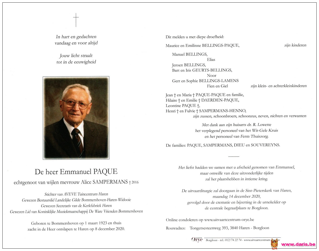 Paque, Emmanuel, geboren op 01-03-1923 te Bommershoven, overleden op 08-12-2020 te Haren op 97-jarige leeftijd.