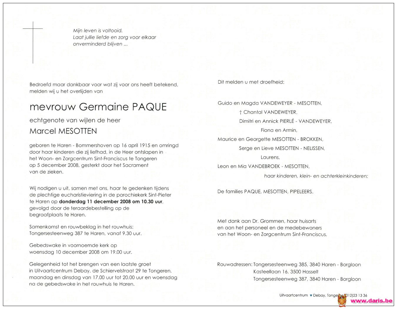Paque, Germaine, geboren op 16-04-1915 te Bommershoven, overleden op 05-12-2008 te Tongeren op 93-jarige leeftijd.