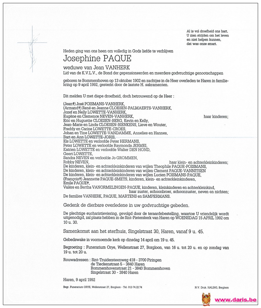 Paque, Josephine, geboren op 13-10-1902 te Bommershoven, overleden op 09-04-1992 te Haren op 89-jarige leeftijd.