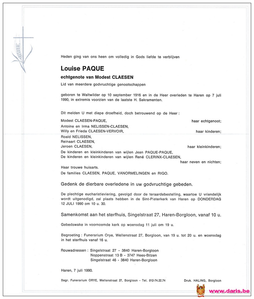 Paque, Louise, geboren op 10-09-1916 te Waltwilder, overleden op 07-07-1990 te Haren op 73-jarige leeftijd.
