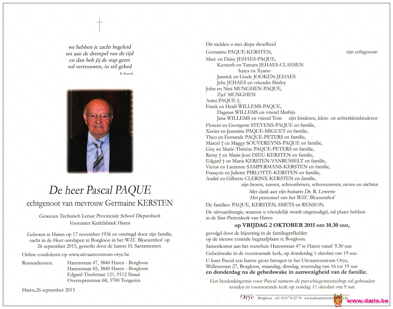 Paque, Pascal, geboren op 17-11-1936 te Bommershoven, overleden op 26-09-2015 te Borgloon op 78-jarige leeftijd.