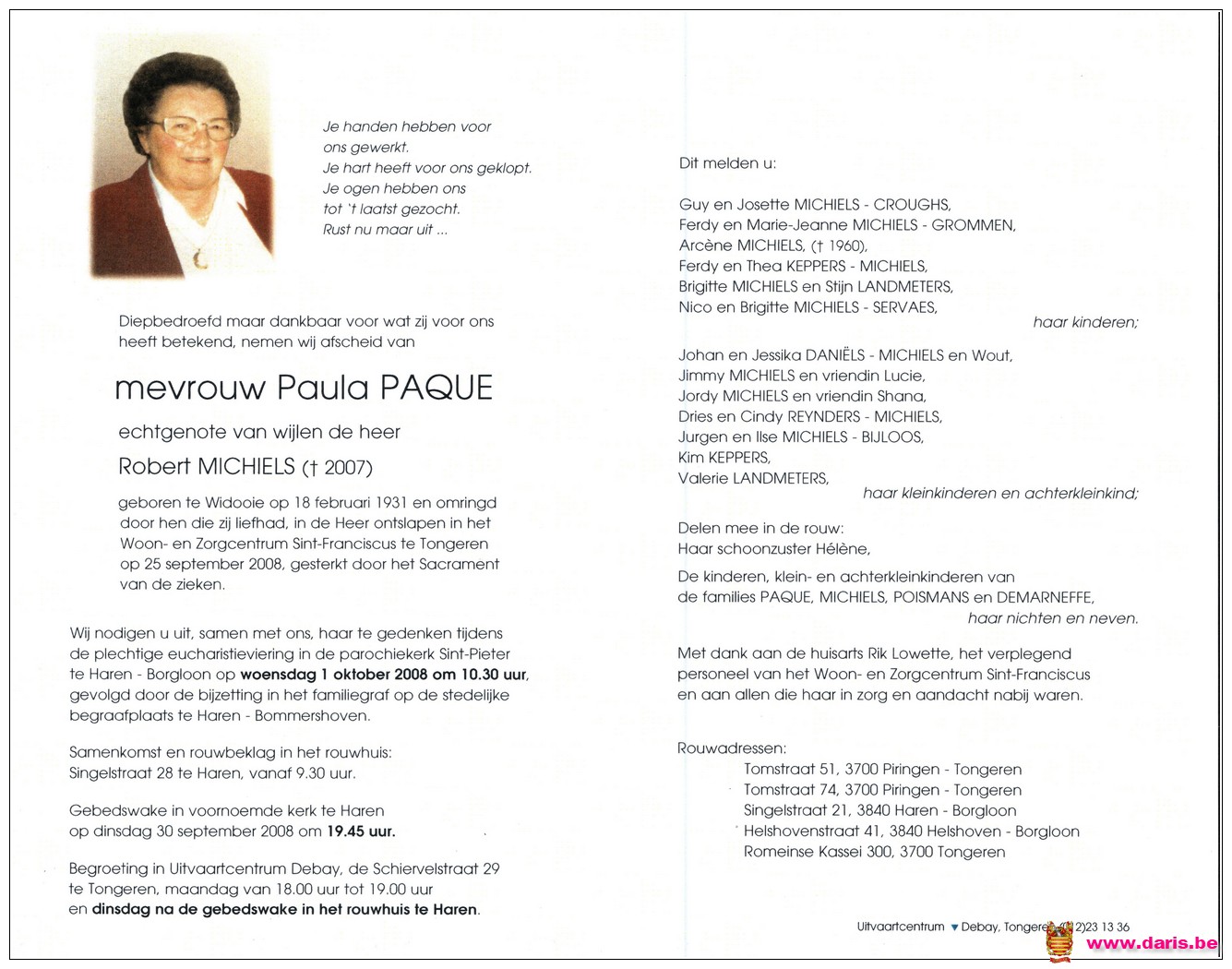 Paque, Paula, geboren op 18-02-1931 te Widooie, overleden op 25-09-2008 te Tongeren op 77-jarige leeftijd.