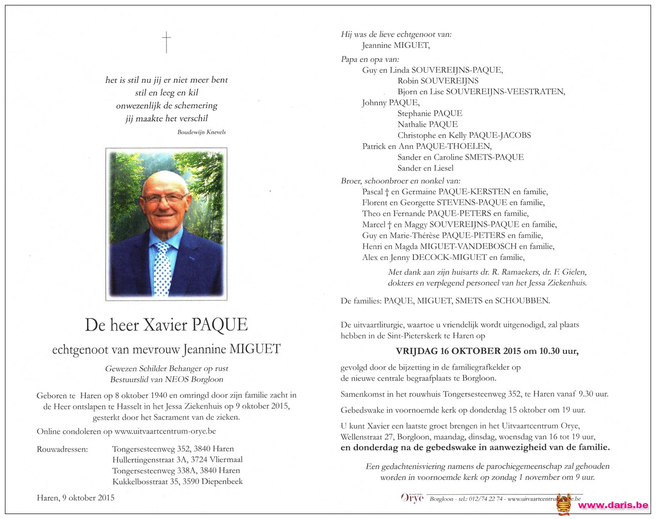 Paque, Xavier, geboren op 08-10-1940 te Bommershoven, overleden op 09-10-2015 te Hasselt op 75-jarige leeftijd.