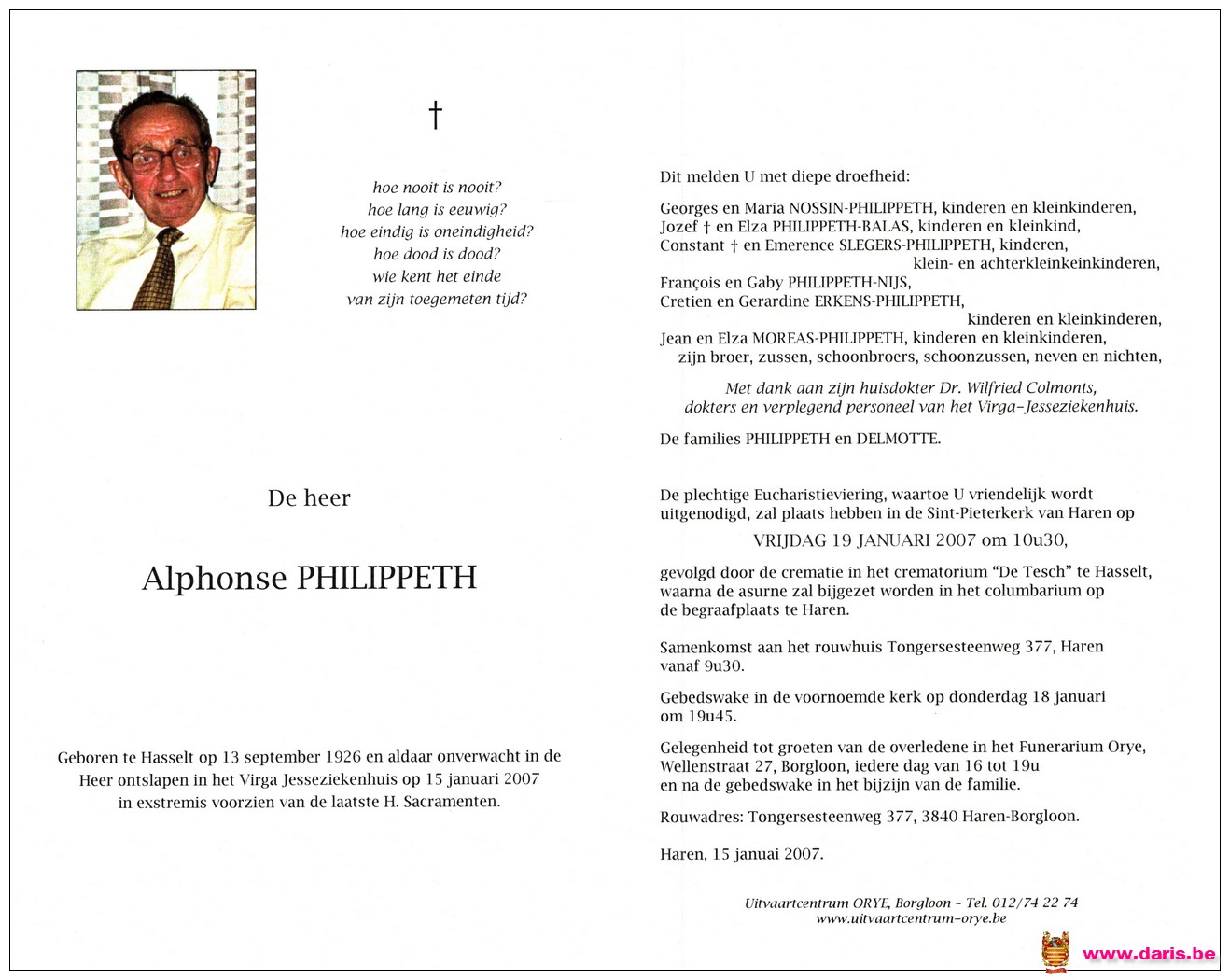 Philippeth, Alfons, geboren op 13-09-1926 te Hasselt, overleden op 15-01-2007 te Hasselt op 80-jarige leeftijd.