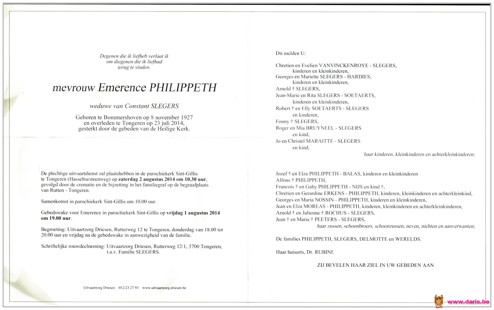 Philippeth, Emerence, geboren op 08-11-1927 te Bommershoven, overleden op 23-07-2014 te Tongeren op 86-jarige leeftijd.