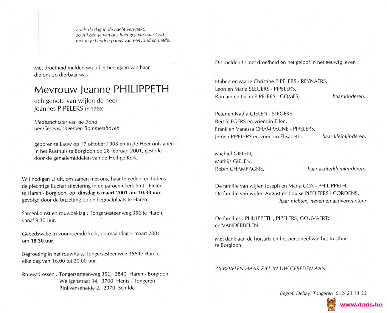 Philippeth, Jeanne, geboren op 17-10-1908 te Lauw, overleden op 28-02-2001 te Borgloon op 92-jarige leeftijd.