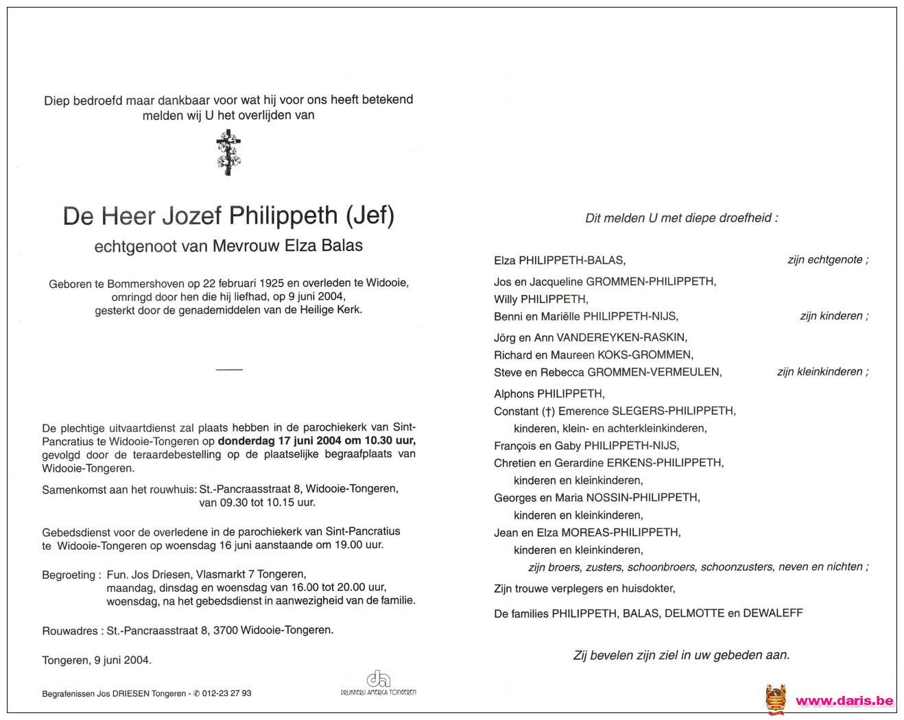 Philippeth, Jozef, geboren op 22-02-1925 te Bommershoven, overleden op 09-06-2004 te Widooie op 79-jarige leeftijd.