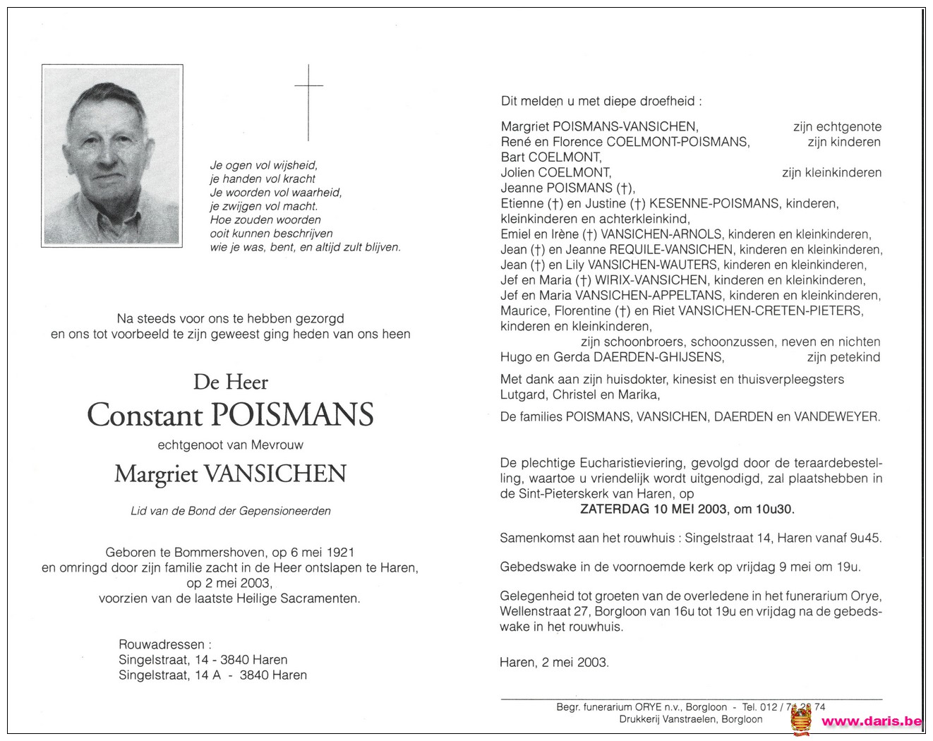 Poismans, Constant, geboren op 06-02-1921 te Bommershoven, overleden op 02-05-2003 te Haren op 82-jarige leeftijd.