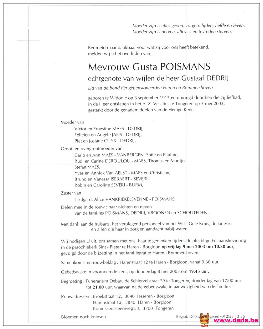Poismans, Gusta, geboren op 03-09-1915 te Widooie, overleden op 03-05-2003 te Tongeren op 87-jarige leeftijd.