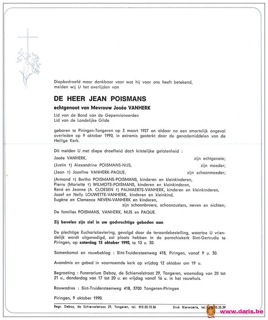 Poismans, Jean, geboren op 03-03-1927 te Piringen, overleden op 09-10-1990 te Piringen op 63-jarige leeftijd.