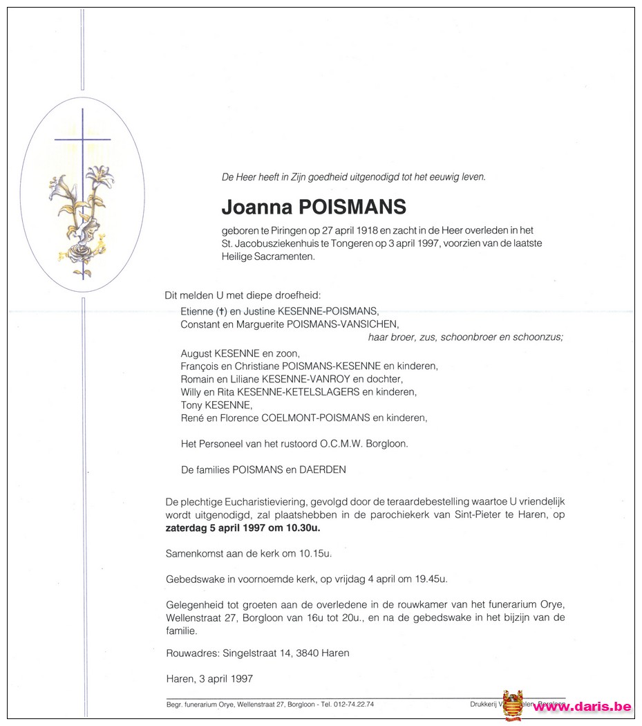 Poismans, Jeanne, geboren op 27-04-1918 te Piringen, overleden op 03-04-1997 te Tongeren op 78-jarige leeftijd.