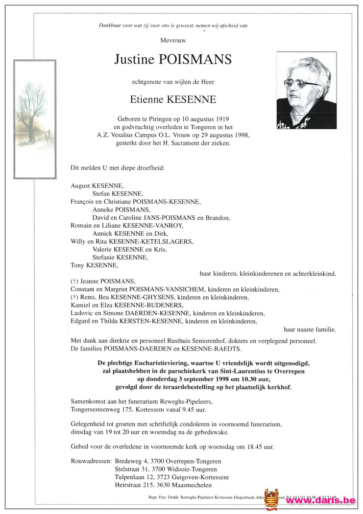 Poismans, Justine, geboren op 10-08-1919 te Piringen, overleden op 29-08-1998 te Tongeren op 79-jarige leeftijd.