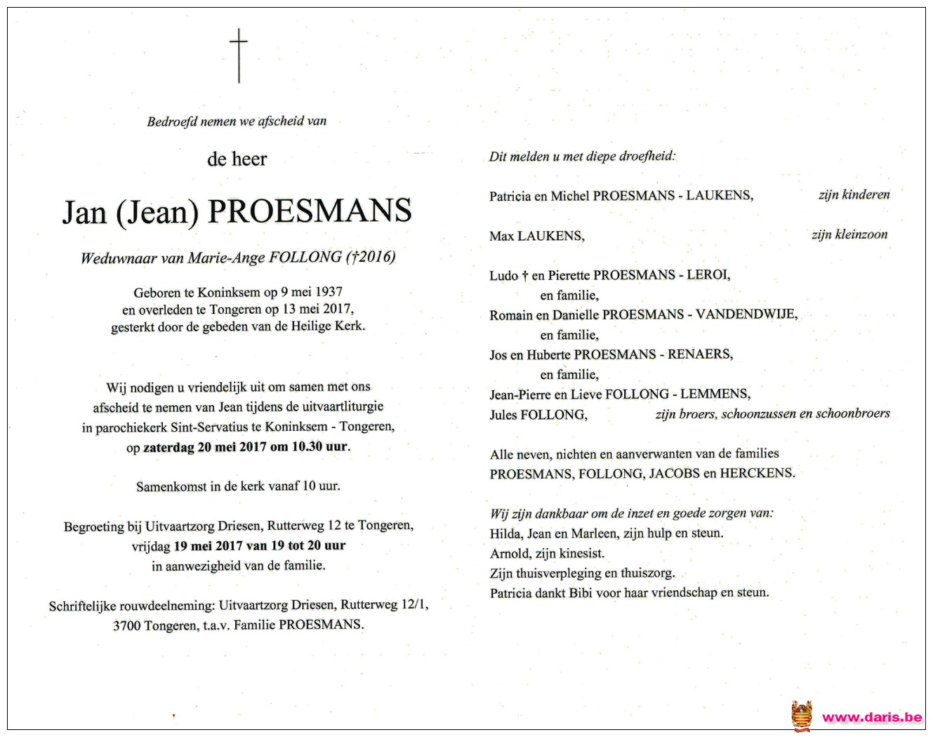 Proesmans, Jean, geboren op 09-05-1937 te Koninksem, overleden op 13-05-2017 te Tongeren op 80-jarige leeftijd.