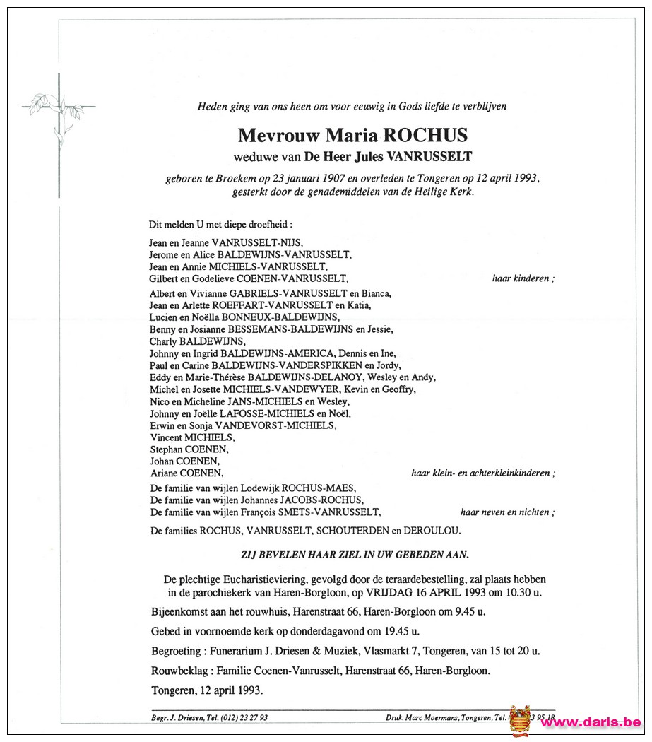 Rochus, Maria, geboren op 23-01-1907 te Broekom, overleden op 12-04-1993 te Tongeren op 86-jarige leeftijd.