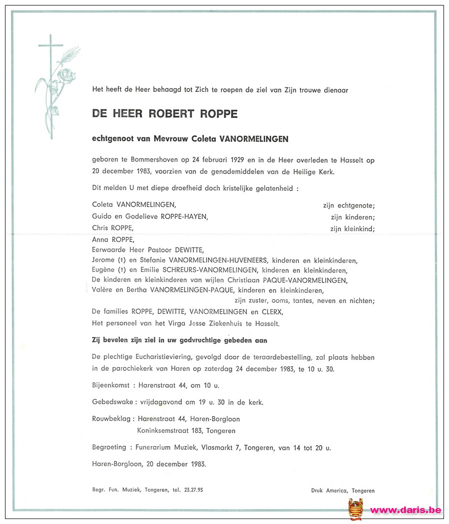 Roppe, Robert, geboren op 24-02-1929 te Bommershoven, overleden op 20-12-1983 te Hasselt op 54-jarige leeftijd.