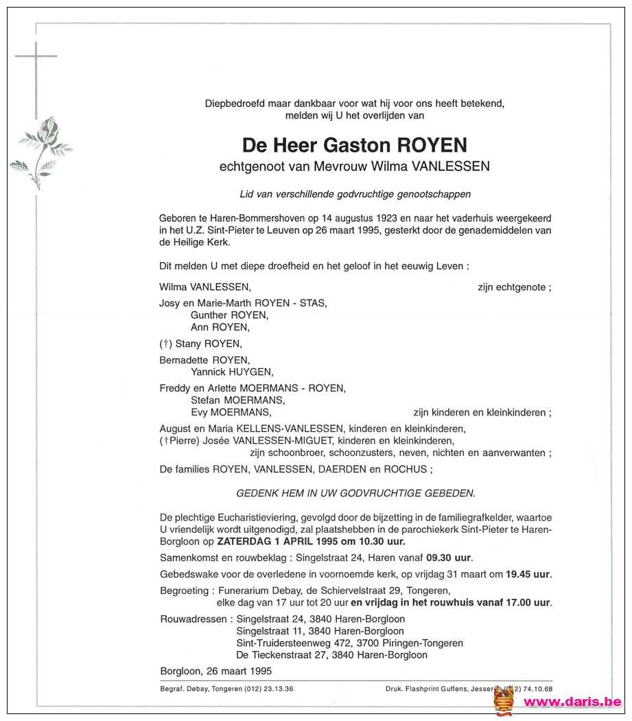 Royen, Gaston, geboren op 14-08-1923 te Bommershoven, overleden op 26-03-1995 te Leuven op 71-jarige leeftijd.
