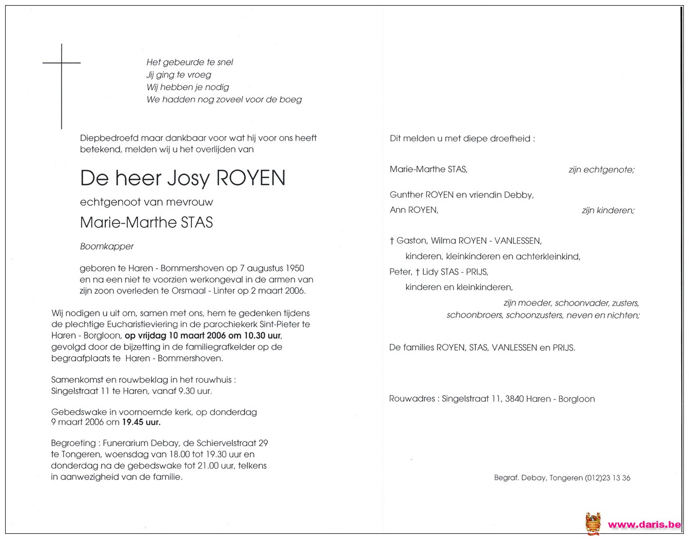 Royen, Josy, geboren op 07-08-1950 te Bommershoven, overleden op 02-03-2006 te Orsmaal op 55-jarige leeftijd.