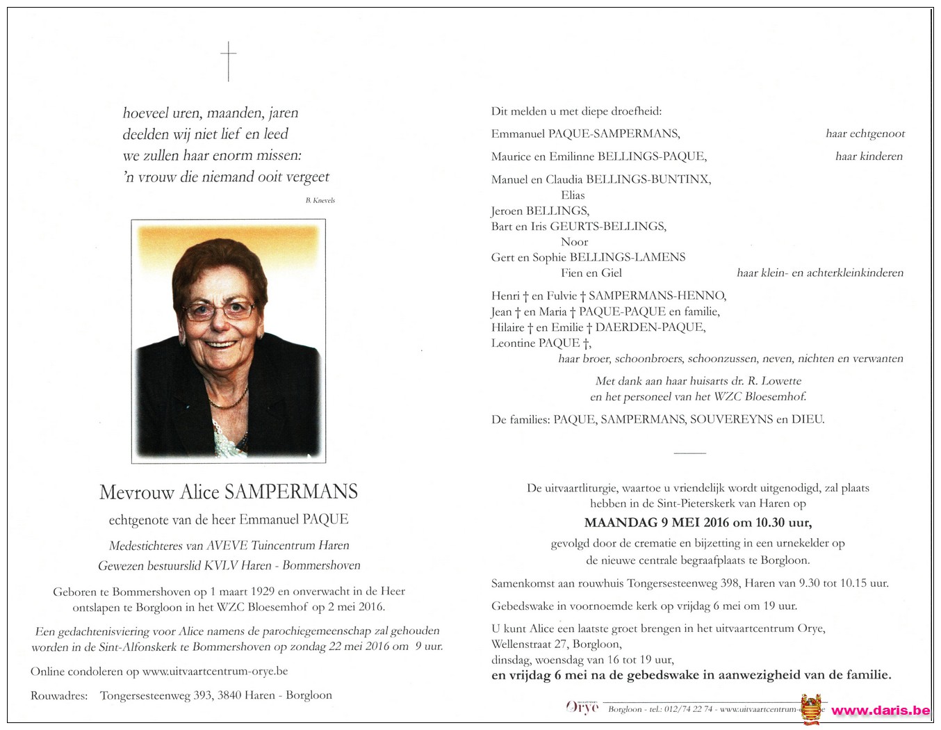 Sampermans, Alice, geboren op 01-03-1929 te Bommershoven, overleden op 02-05-2016 te Borgloon op 87-jarige leeftijd.