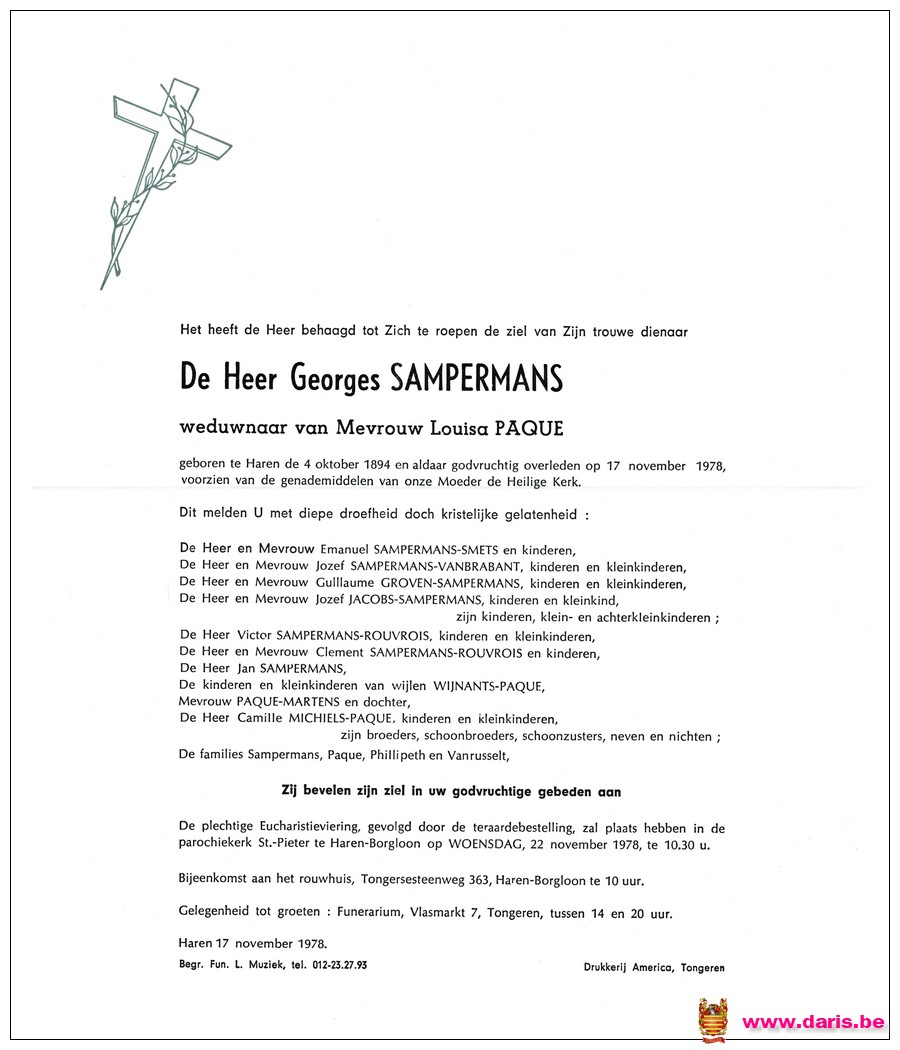Sampermans, Georges, geboren op 04-10-1894 te Bommershoven, overleden op 17-11-1978 te Haren op 84-jarige leeftijd.