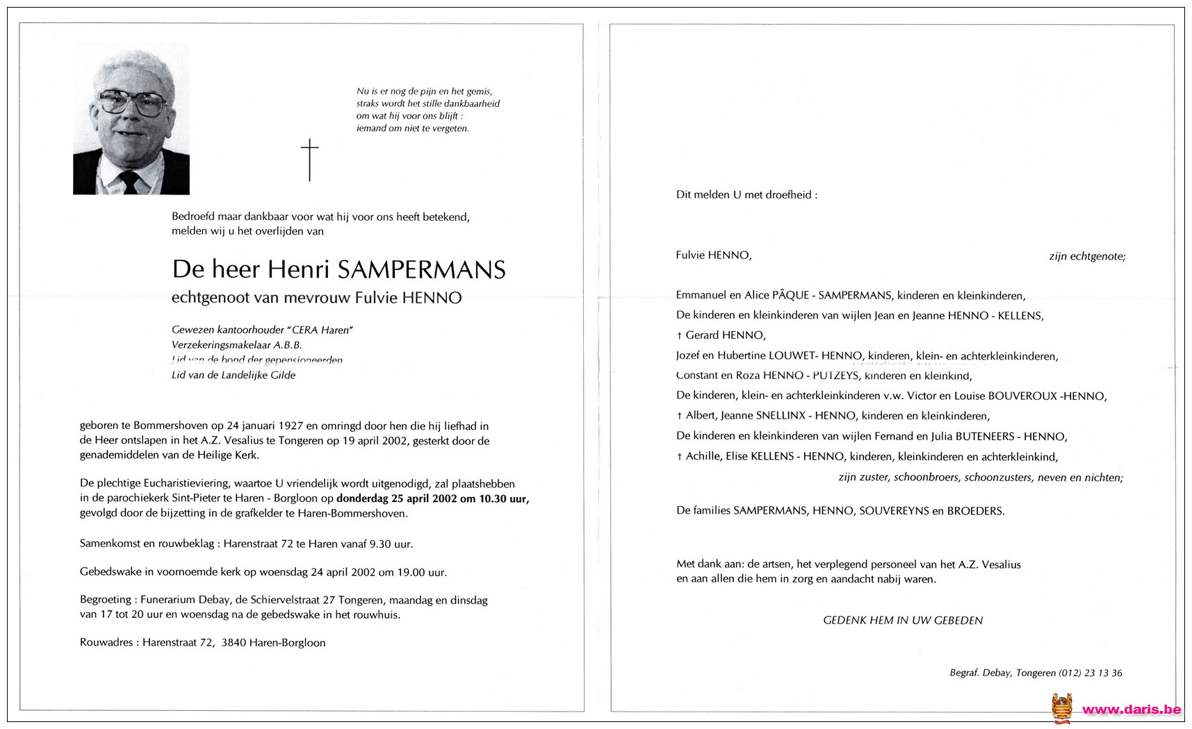 Sampermans, Henri, geboren op 24-01-1927 te Bommershoven, overleden op 19-04-2002 te Tongeren op 75-jarige leeftijd.
