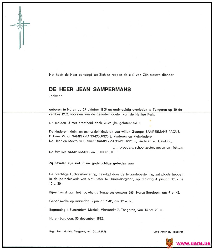 Sampermans, Jean, geboren op 29-10-1909 te Bommershoven, overleden op 30-12-1982 te Tongeren op 73-jarige leeftijd.