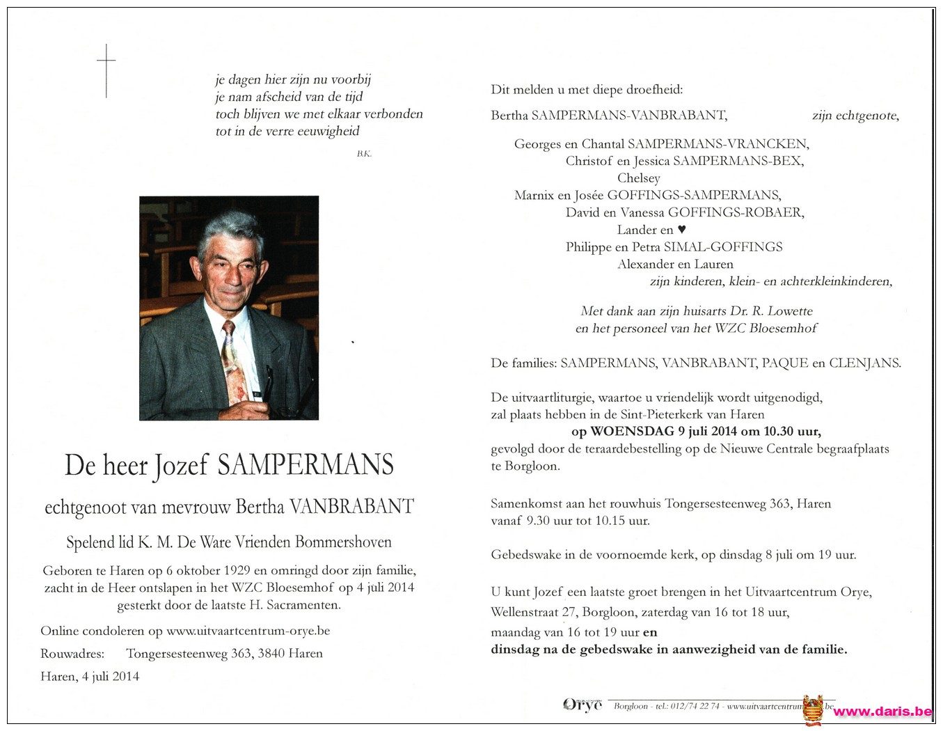 Sampermans, Jozef, geboren op 06-10-1929 te Bommershoven, overleden op 04-07-2014 te Borgloon op 84-jarige leeftijd.