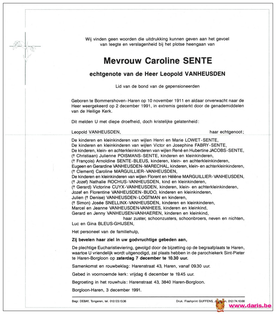 Sente, Caroline, geboren op 10-11-1911 te Bommershoven, overleden op 02-11-1991 te Haren op 79-jarige leeftijd.