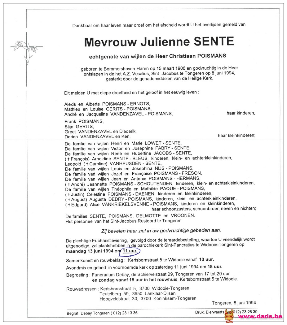 Sente, Julienne, geboren op 15-03-1906 te Bommershoven, overleden op 08-06-1994 te Tongeren op 88-jarige leeftijd.