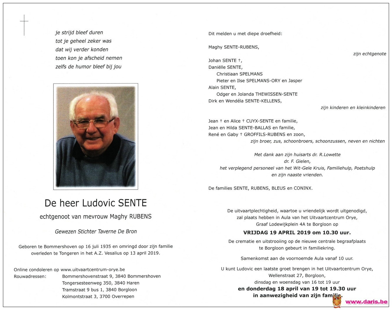 Sente, Ludovic, geboren op 16-07-1935 te Bommershoven, overleden op 13-04-2019 te Tongeren op 83-jarige leeftijd.