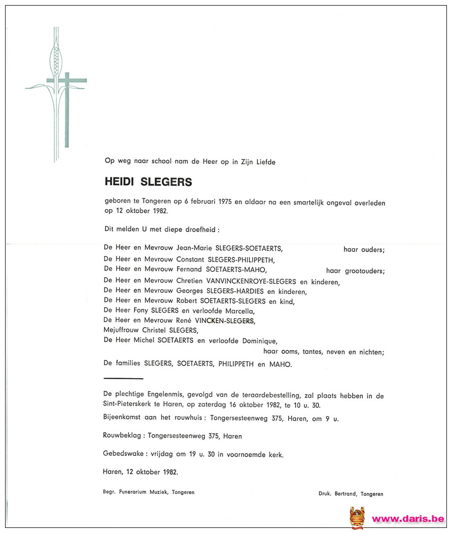 Slegers, Heidi, geboren op 06-02-1975 te Tongeren, overleden op 12-10-1982 te Tongeren op 7-jarige leeftijd.