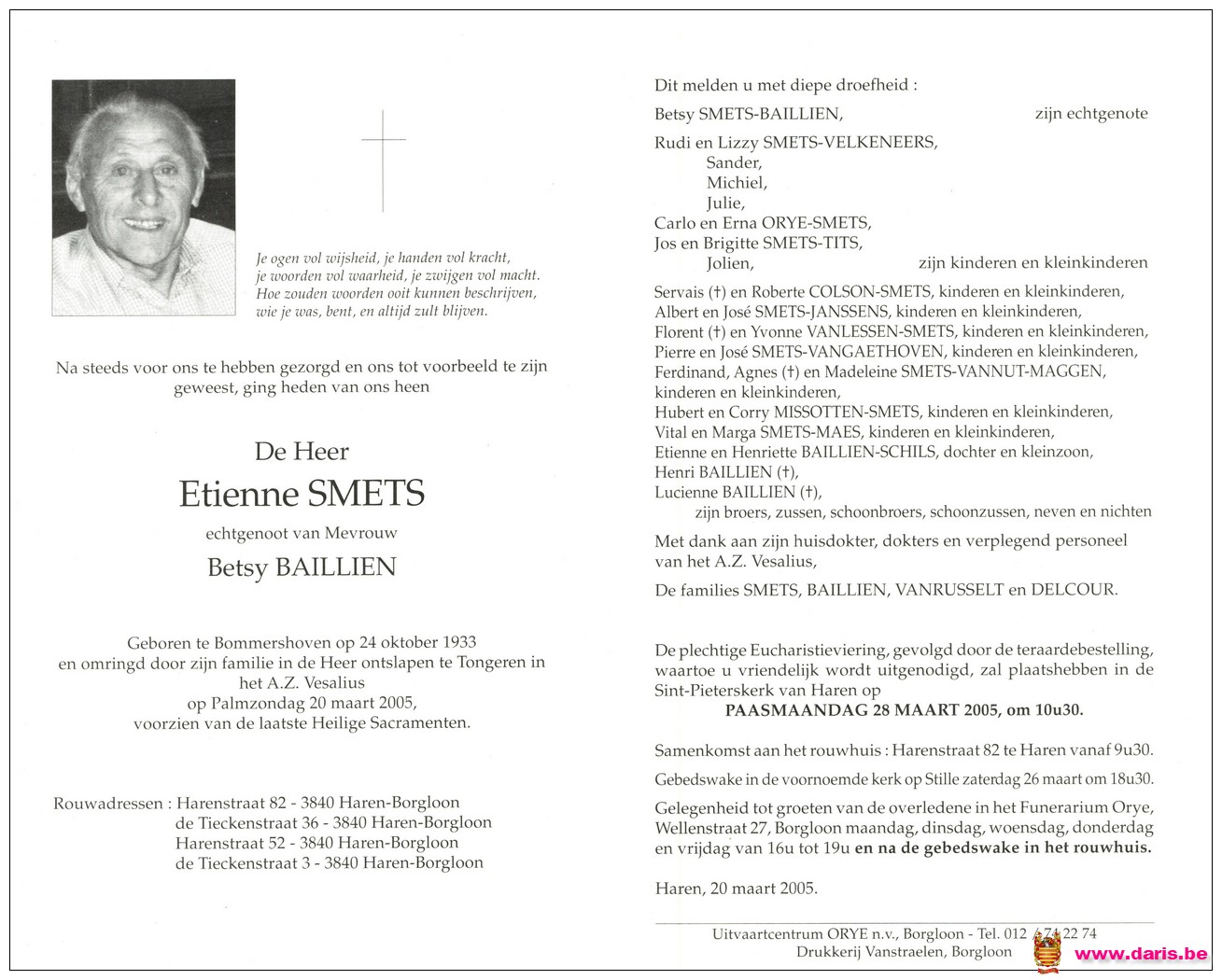 Smets, Etienne, geboren op 24-10-1933 te Bommershoven, overleden op 20-03-2005 te Tongeren op 71-jarige leeftijd.