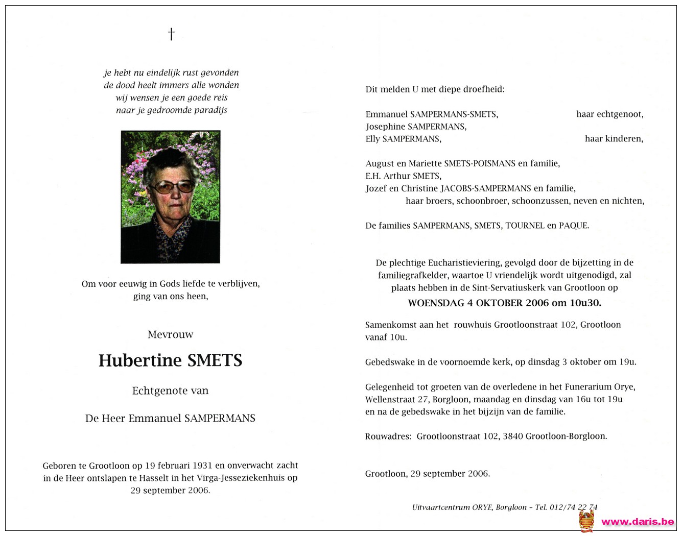 Smets, Hubertine, geboren op 19-02-1931 te Groot-Loon, overleden op 29-09-2006 te Hasselt op 75-jarige leeftijd.