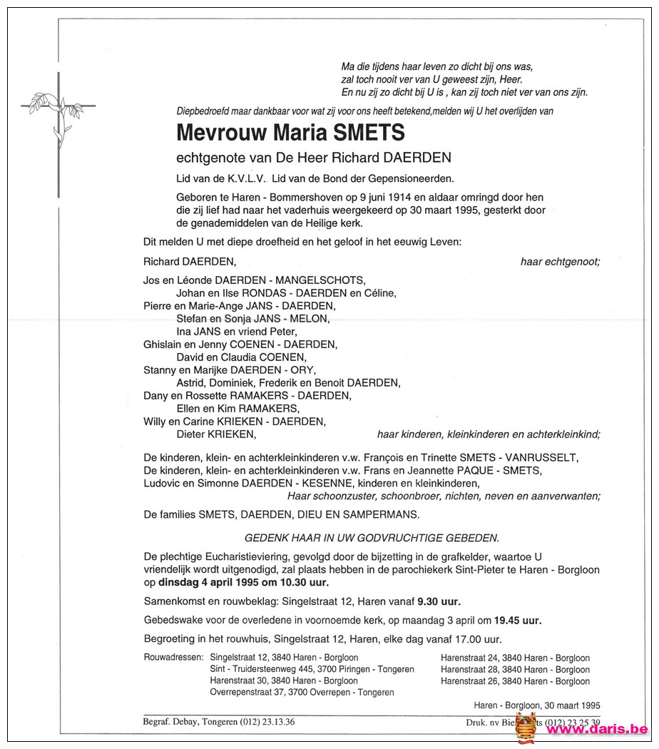 Smets, Maria, geboren op 09-06-1914 te Bommershoven, overleden op 30-03-1995 te Haren op 80-jarige leeftijd.