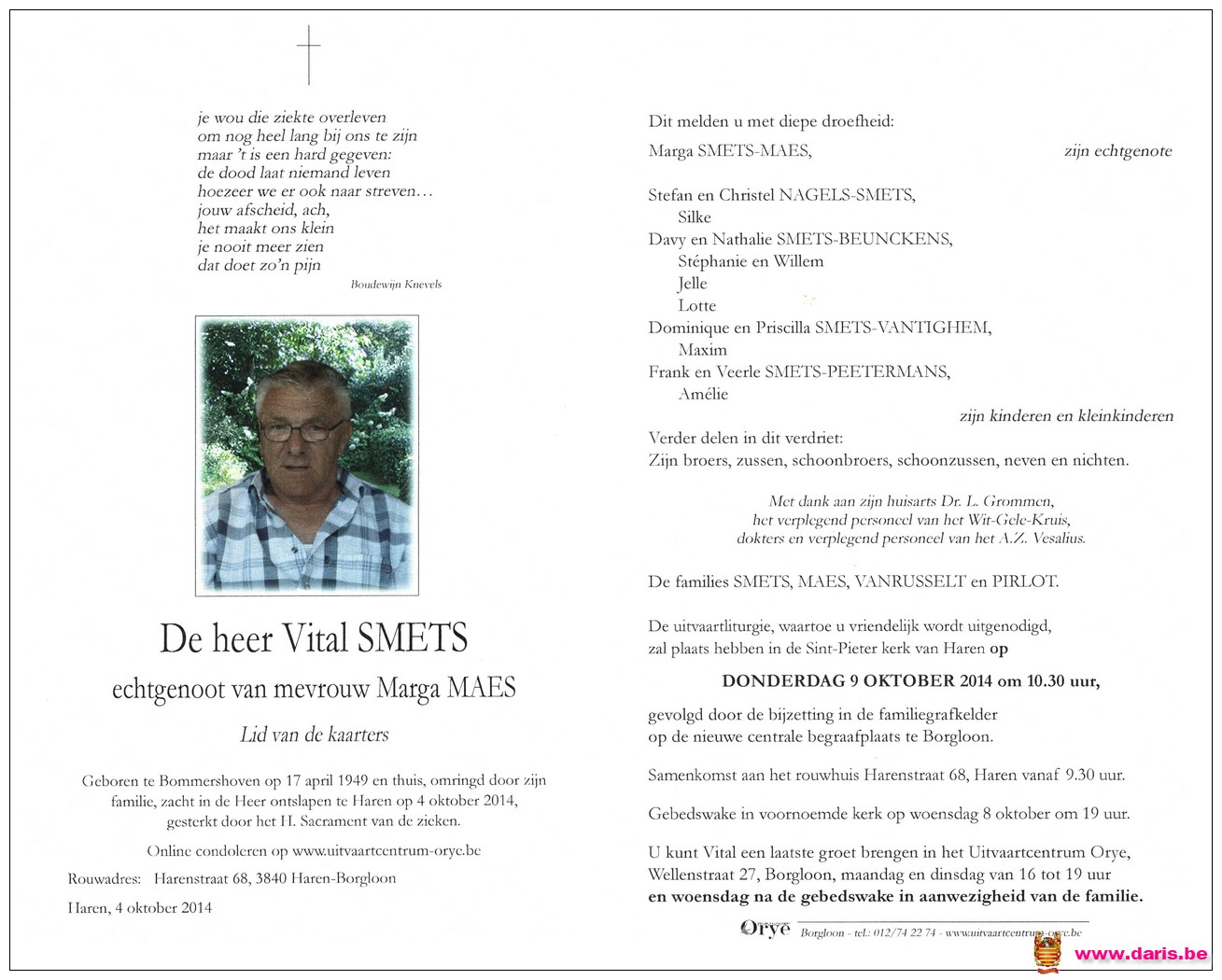 Smets, Vital, geboren op 17-04-1949 te Bommershoven, overleden op 04-10-2014 te Haren op 65-jarige leeftijd.