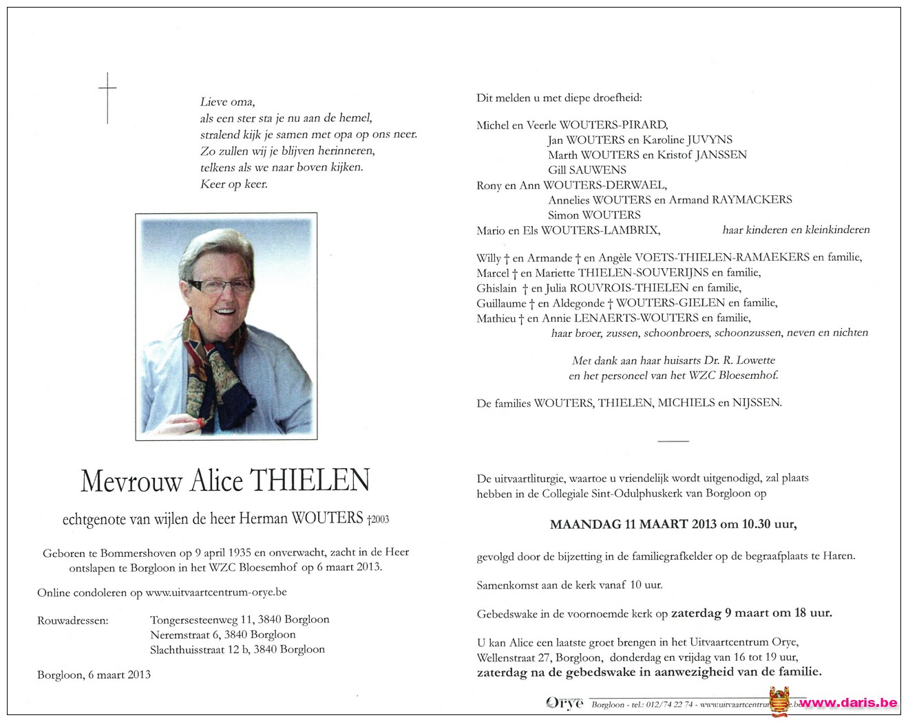 Thielen, Alice, geboren op 09-04-1935 te Bommershoven, overleden op 06-03-2013 te Borgloon op 77-jarige leeftijd.