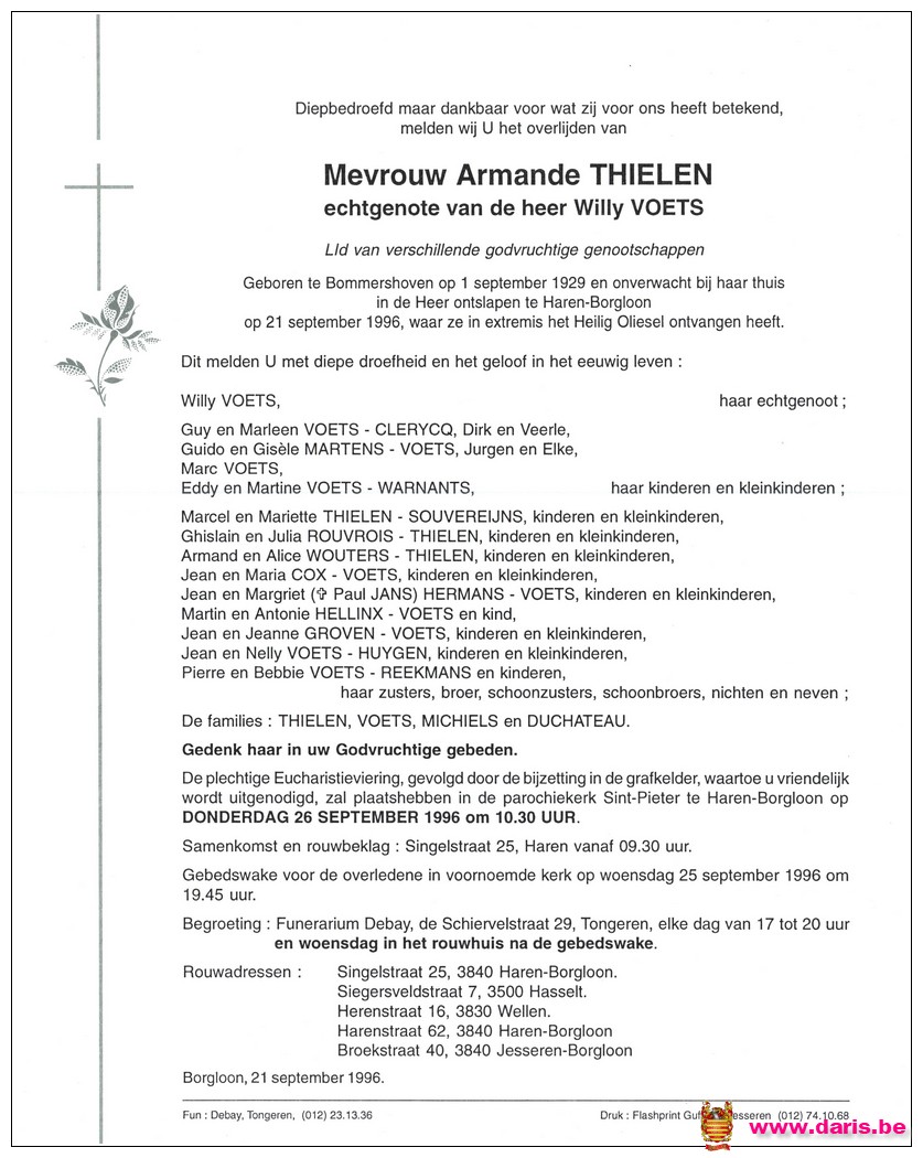 Thielen, Armande, geboren op 01-09-1929 te Bommershoven, overleden op 21-09-1996 te Haren op 67-jarige leeftijd.