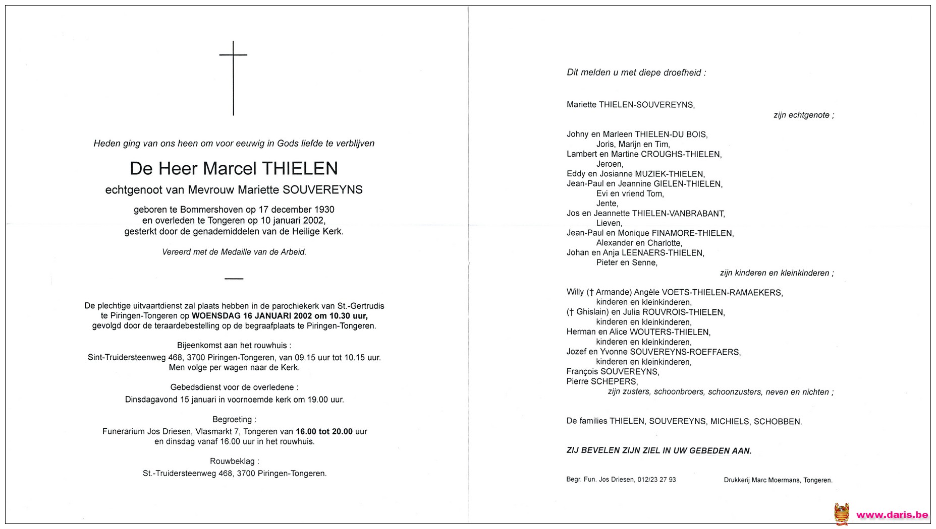 Thielen, Marcel, geboren op 17-12-1930 te Bommershoven, overleden op 10-01-2002 te Piringen op 71-jarige leeftijd.
